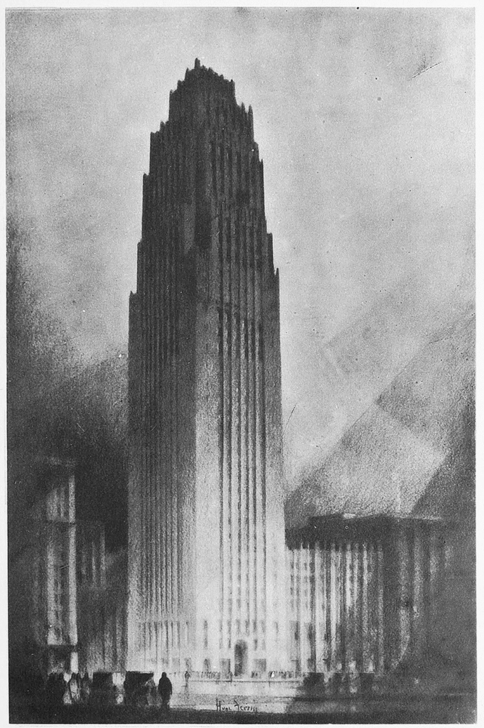 Ferriss got something out of it, though: a drawing he could reuse for imagining the architecture of the future. The style and certain incidental details make it clear that Ferriss’s “Modern Ziggurats” drawing, featured in Metropolis of Tomorrow, must surely have once belonged to this sequence of renderings.