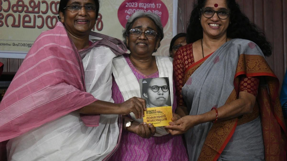 Congress leader Shanimol Usman and CPI(M) leader C.S. Sujatha with Dakshayani Velayudhan’s daughter Meera Velayudhan at the release of Cherai Ramadas’ book on Dakshayani Velayudhan at Maharaja’s College in Kochi | Photo Credit: THULASI KAKKAT