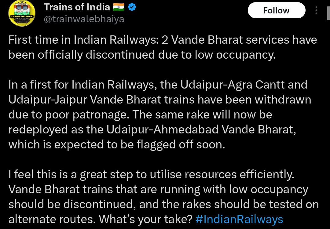The Udaipur–Agra Vande Bharat is being withdrawn with the official explanation that “there are not enough passengers.” Behind that bland line lies a familiar story of headline-driven infrastructure, inflated optics and an unwillingness to confront basic arithmetic: demand, fares, travel time and public money.