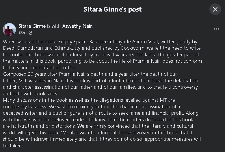 The daughters of M.T. Vasudevan Nair – Sithara Girme and Aswathy Nair – have issued a strong joint statement on the recently published book “Empty Space: Bashpeekrithayude Aaram Viral” accusing the authors of defamation and deliberate character assassination. The book was published by Bookworm and written by Didi Damodaran and Ecchumukutty. The statement of MT’s daughters pointed out that the book contains unverified and false claims based on heresy.