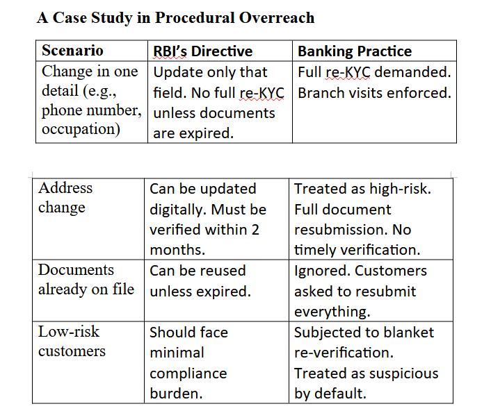 The RBI permits modular updates—banks enforce blanket resets. A phone number change should not trigger a full compliance cycle. An address update should not require a branch visit. Yet banks continue to treat every minor change as a gateway to procedural excess.
