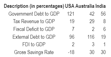 Let us look at the following data across the U.S. (AA+), Australia (AAA) and India (Baa3) to understand if such rating divergences really reflect underlying weaknesses or perceived strengths. Data is as of March 2023, sourced from info.ceicdata.com.