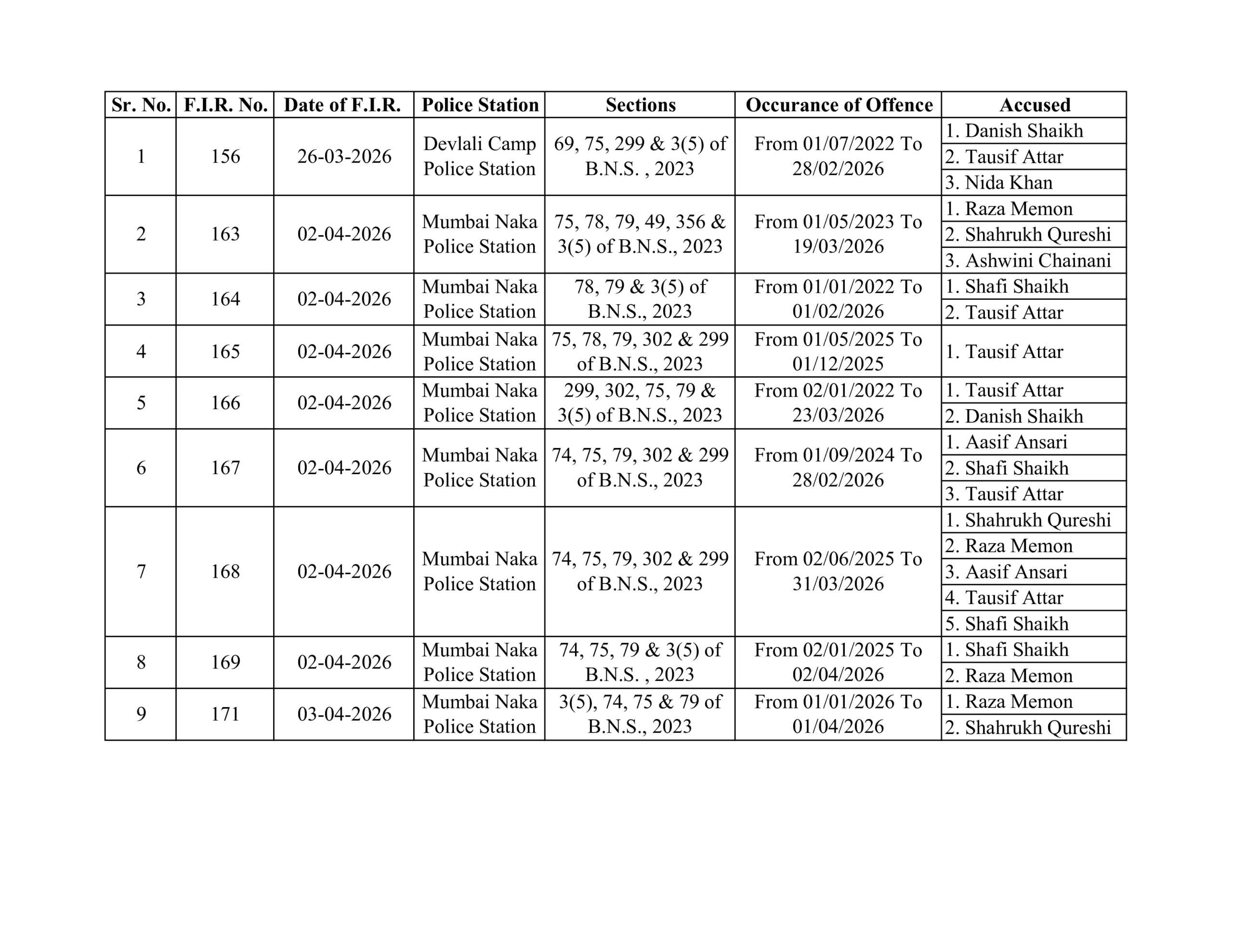 The legal foundation of the case rests on nine FIRs registered between March 26 and April 3, 2026, across Deolali Camp and Mumbai Naka police stations. These FIRs, taken together, form the only formal basis on which the case currently stands, and any assessment of the matter must begin with them.