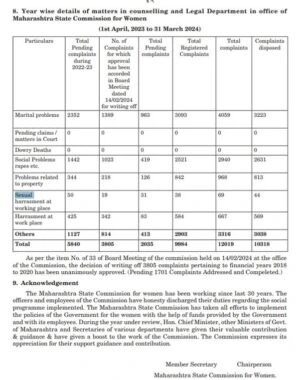 Data from the Maharashtra State Commission for Women for 2023–24 provides important context for understanding how workplace-related complaints are typically registered and addressed. Out of a total of 12,019 complaints handled during the year, the overwhelming majority relate to marital disputes (4059 cases) and broader social issues, including rape (2940 cases). In comparison, complaints specifically categorised as sexual harassment at the workplace number just 69, with 44 disposed of during the same period. This indicates that while such cases are serious, they form a relatively small proportion of the overall complaints landscape.