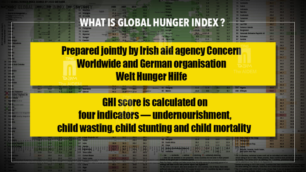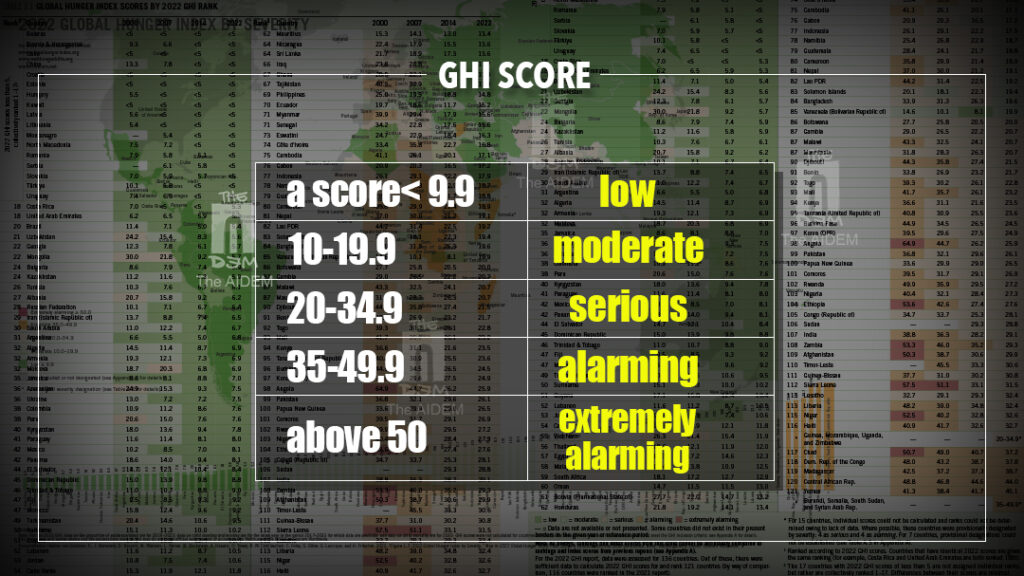 The Global Hunger Index (GHI) is a tool for comprehensively measuring and tracking hunger at global, regional, and national levels. GHI scores are based on the values of four component indicators – undernourishment, child stunting, child wasting and child mortality. The GHI score is calculated on a 100-point scale reflecting the severity of hunger, where zero is the best score (no hunger) and 100 is the worst.
