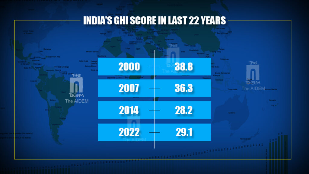 On the whole, India has shown a slight worsening with its GHI score increasing from 28.2 in 2014 to 29.1 in 2022. Though the GHI is an annual report, the rankings are not comparable across different years.