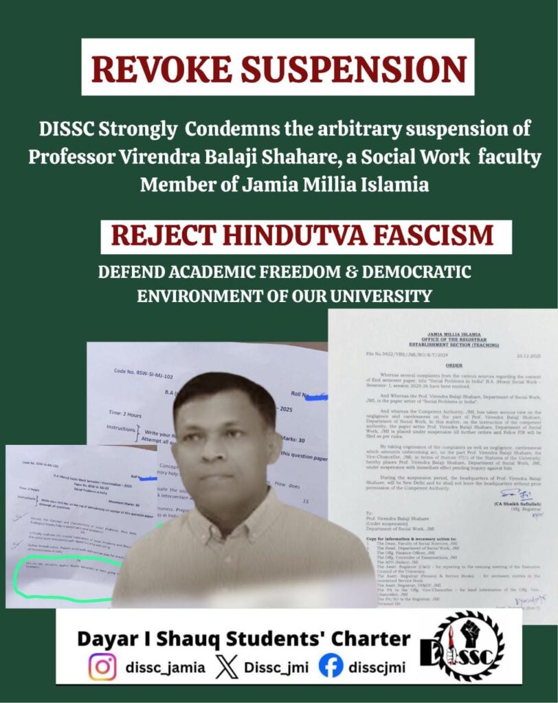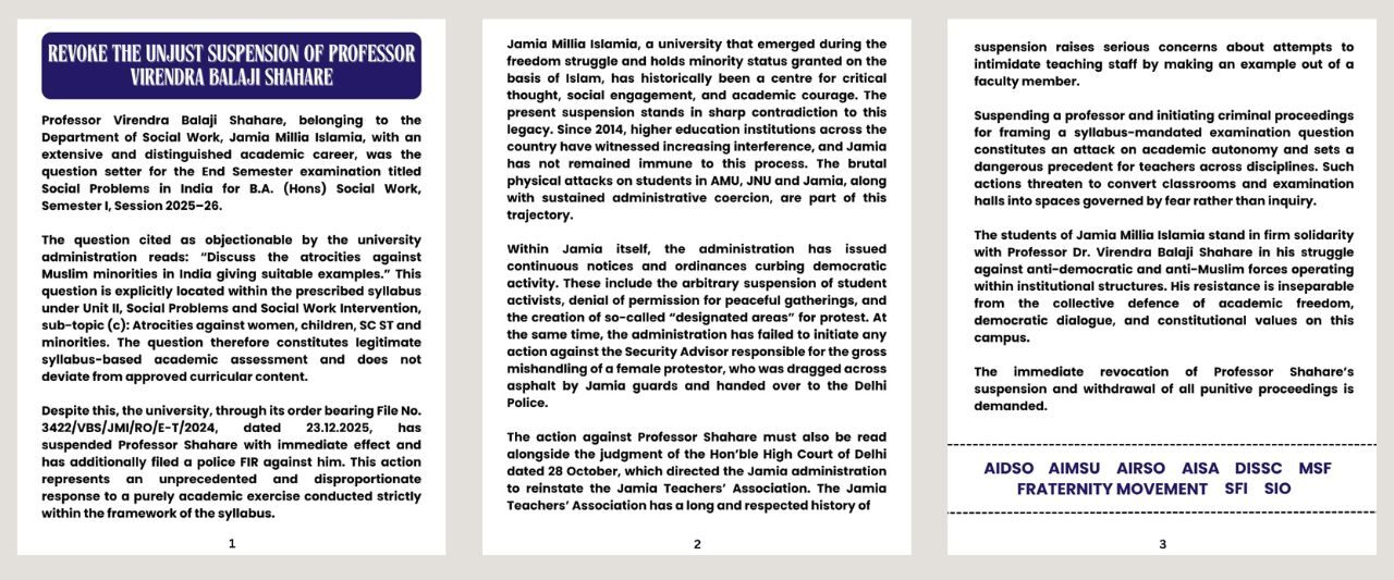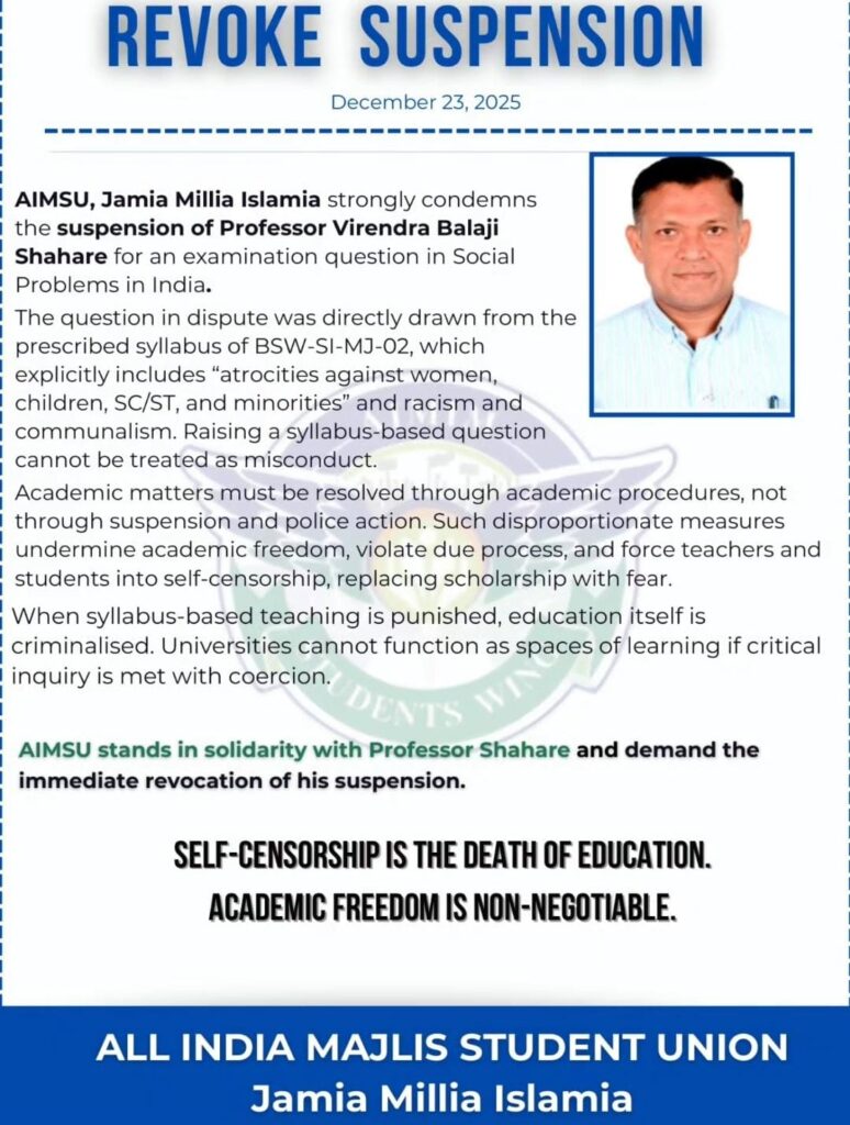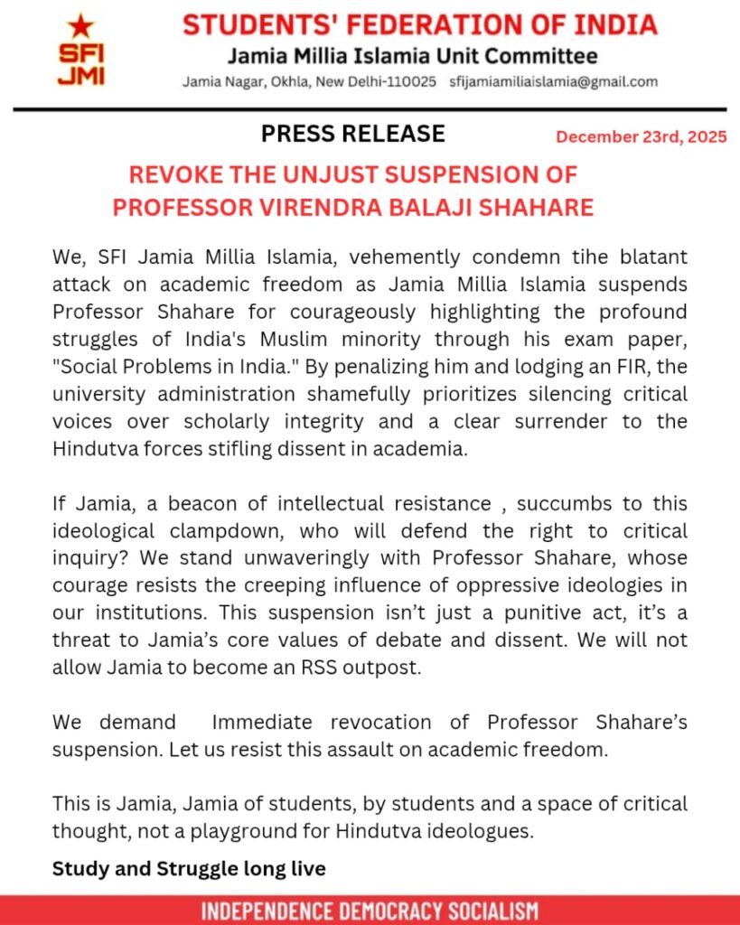 Students of Jamia Millia Islamia have expressed firm solidarity with Professor Sahare, viewing his case as part of a broader struggle against anti-democratic and anti-Muslim forces operating within institutional structures.A separate statement condemning the suspension by a collective of students organisations argues that initiating criminal proceedings over a syllabus-mandated examination question represents an assault on academic autonomy and risks creating a climate of fear within universities. It points out that the action constitutes an unprecedented and disproportionate response to a purely academic exercise conducted strictly within the framework of the syllabus.