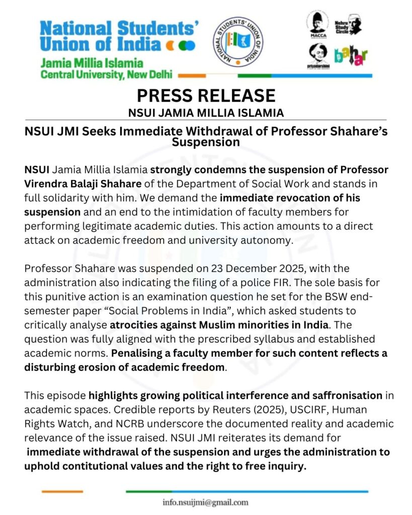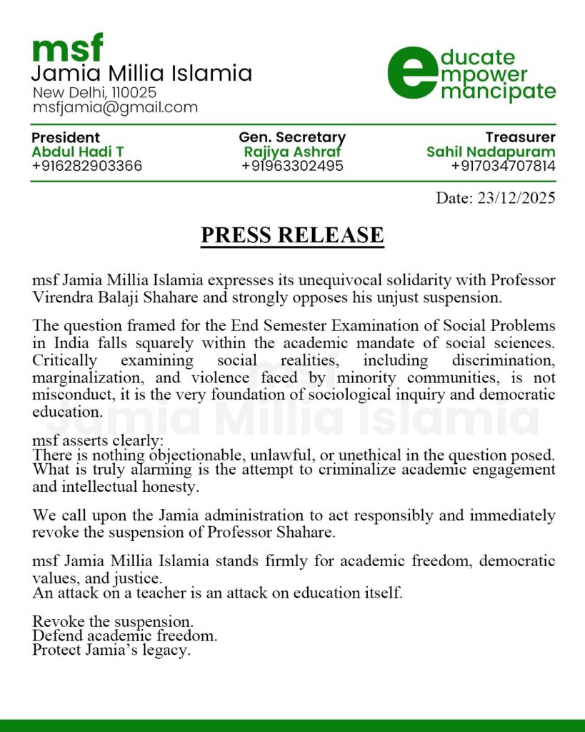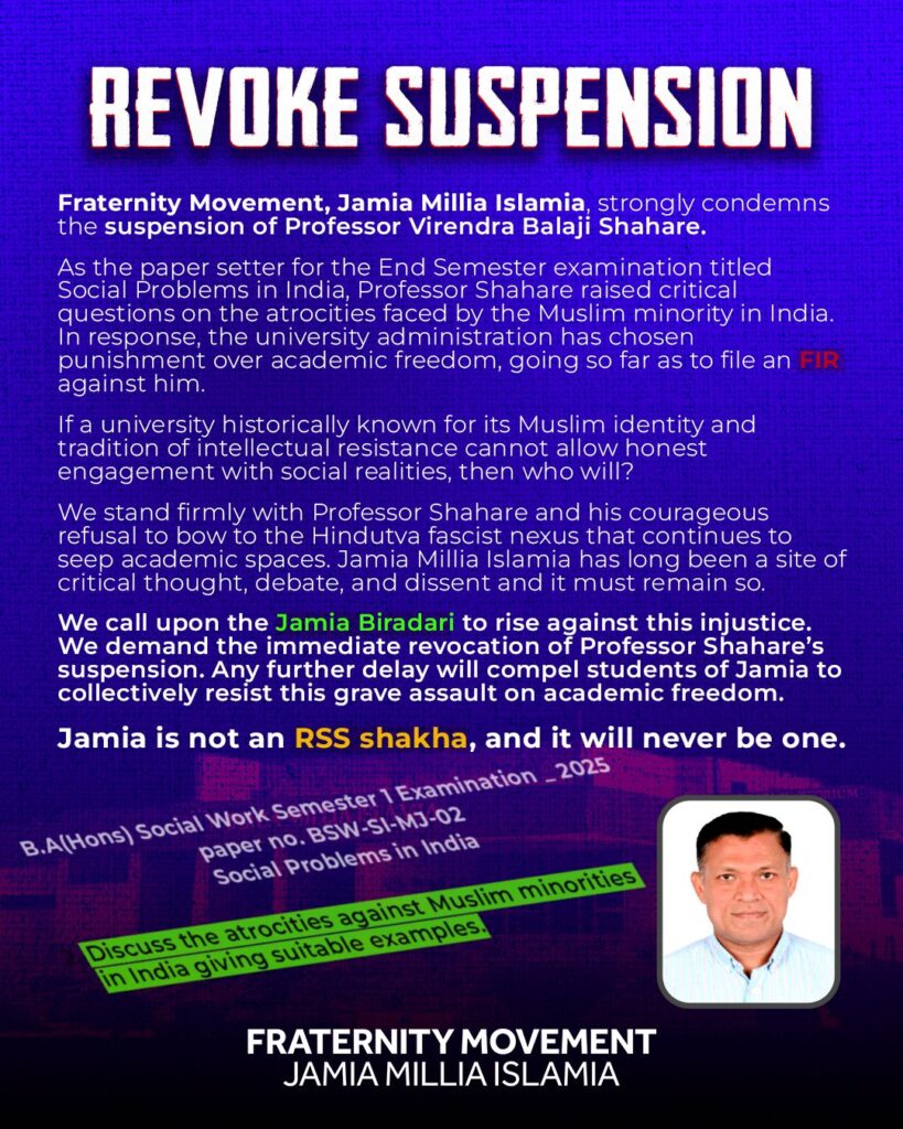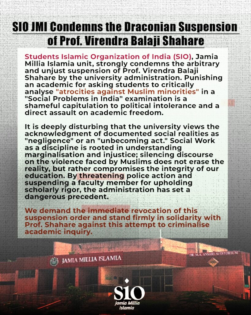 Students of Jamia Millia Islamia have expressed firm solidarity with Professor Sahare, viewing his case as part of a broader struggle against anti-democratic and anti-Muslim forces operating within institutional structures.A separate statement condemning the suspension by a collective of students organisations argues that initiating criminal proceedings over a syllabus-mandated examination question represents an assault on academic autonomy and risks creating a climate of fear within universities. It points out that the action constitutes an unprecedented and disproportionate response to a purely academic exercise conducted strictly within the framework of the syllabus.