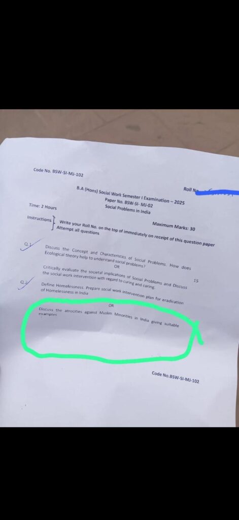 At the centre of the controversy is a question in the BA (Hons) Social Work first-semester paper, Social Problems in India, which asked students to “discuss the atrocities against Muslim minorities in India, giving suitable examples.” The administration has cited this question as objectionable while marshalling arguments for the suspension. The question reads in full: “Discuss the atrocities against Muslim minorities in India, giving suitable examples.”