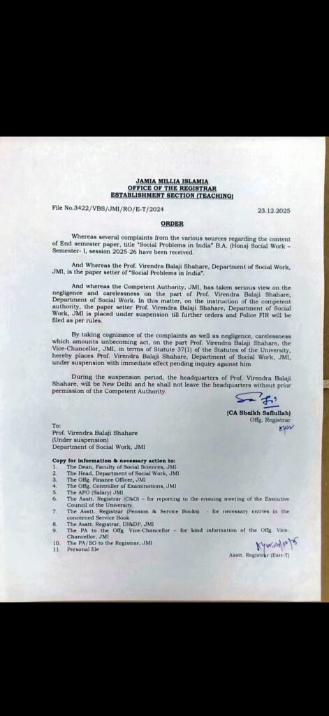 Despite this, the university, through an order bearing File No. 3422/VBS/JMI/RO/E-T/2024 dated 23.12.2025, suspended Professor Sahare with immediate effect and additionally filed a police FIR against him.