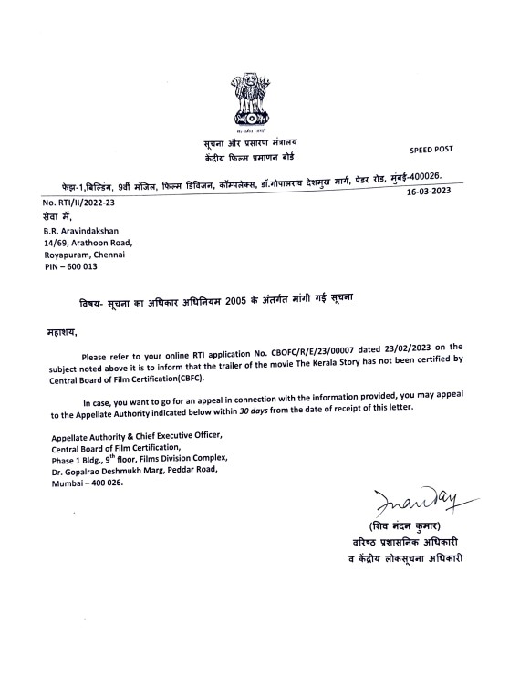 കള്ളങ്ങൾ ഊരുതെണ്ടുന്ന കാലത്ത് കലയും സാഹിത്യവും ഒന്നും അതിൽ നിന്ന് അന്യമാവുന്നില്ല. കഥകൾ ഉണ്ടാവുന്നതല്ല, ഉണ്ടാക്കുന്നതാണ്. കഴിഞ്ഞ വർഷം നവംബറിൽ ട്രെയ്ലർ പുറത്തുവന്ന ‘ദി കേരള സ്റ്റോറി’ എന്ന സിനിമയും ഈ ഗണത്തിൽ പെട്ടതാണ് എന്ന് അന്നേ ചൂണ്ടിക്കാണിക്കപ്പെട്ടിരുന്നു. കേരളത്തെ പറ്റി തെറ്റും അപകീർത്തികരവുമായ ആക്ഷേപങ്ങൾ ഉയർത്തുന്ന സിനിമയുടെ ട്രെയ്ലർ സെൻസർ സർട്ടിഫിക്കറ്റ് ഇല്ലാതെയാണ് പുറത്തിറങ്ങിയത്. സെൻട്രൽ ബോർഡ് ഓഫ് ഫിലിം സേർട്ടിഫിക്കേഷൻ (സിബിഎഫ്സി) തന്നെയാണ് ഈ “സർട്ടിഫിക്കറ്റ് ഇല്ലായ്മ” വെളിപ്പെടുത്തിയത്. തമിഴ്നാട് കേന്ദ്രീകരിച്ചു പ്രവർത്തിക്കുന്ന പ്രശസ്ത മാധ്യമപ്രവർത്തകനായ ബി ആർ അരവിന്ദാക്ഷന് വിവരാവകാശനിയമപ്രകാരം നൽകിയ മറുപടിയിലാണ് ഈ കാര്യം പറഞ്ഞിരിക്കുന്നത്. 2023 ഫെബ്രുവരി 23 നാണ് അരവിന്ദാക്ഷൻ വിവരാവകാശ നിയമപ്രകാരം സെൻട്രൽ ബോർഡ് ഓഫ് ഫിലിം സേർട്ടിഫിക്കേഷനോട് ഈ സിനിമയുടെ ട്രെയ്ലർ സെൻസർ ചെയ്തിട്ടുണ്ടോ എന്ന് ചോദിച്ചുകൊണ്ട് ഉത്തരം ലഭിക്കാനായി അപേക്ഷ നൽകിയത്. 2023 മാർച്ച് 16 ന് സെൻസർ ബോർഡ് ഇതിനു മറുപടി നൽകി. ഈ സിനിമാ ട്രെയ്ലർ സെൻസർ ചെയ്തിട്ടില്ല എന്നും, ഇക്കാര്യത്തിൽ തുടർനടപടി ആഗ്രഹിക്കുന്നുണ്ടെങ്കിൽ മറുപടി ലഭിച്ചു 30 ദിവസത്തിനകം സെൻസർ ബോർഡിന്റെ അപ്പലേറ്റ് അതോറിറ്റിക്ക് പരാതി നൽകാം എന്നും മറുപടി കത്തിൽ പറയുന്നു.
