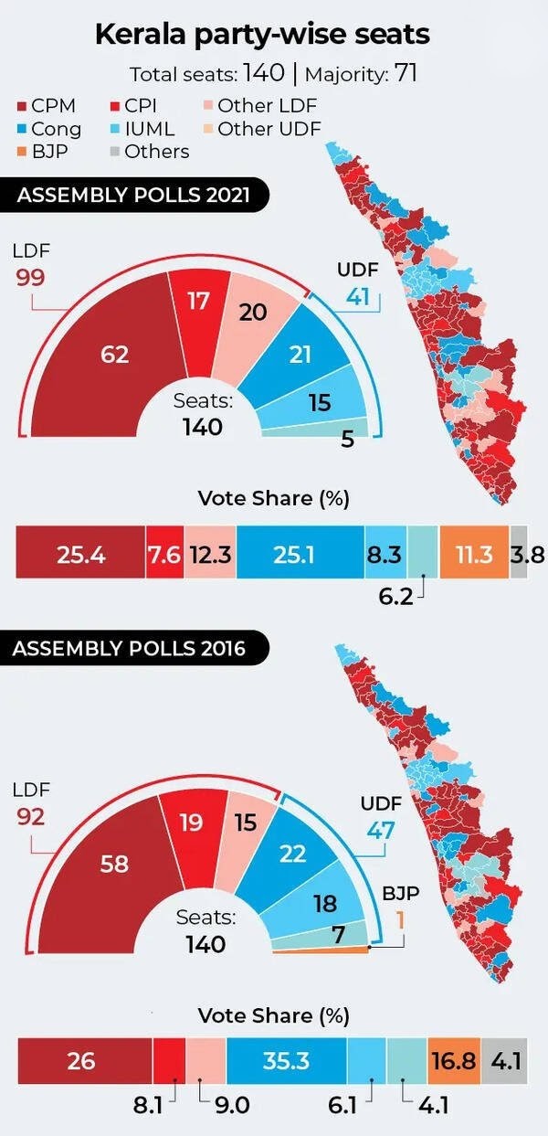 കഴിഞ്ഞദിവസം നടന്ന തിരഞ്ഞെടുപ്പിൽ ആര്ക്കാണ് വിജയം ഉണ്ടാവുക എന്ന് പറയാനല്ല ഈ കുറിപ്പ്. അത് സെഫോലോജിസ്റ്റ്കളുടെ പണിയാണല്ലോ. ഞാൻ സെഫോലോജിസ്റ്റ് അല്ല. എന്നാല് തിരഞ്ഞെടുപ്പ് കഴിഞ്ഞെങ്കിലും അടിസ്ഥാനപരമായ ചില വോട്ടിംഗ് കാര്യങ്ങള് ഇനിയും ചര്ച്ച ചെയ്യപ്പെടെണ്ടതുണ്ട്. 1980 മുതൽ 2021 വരെയുള്ള കേരള നിയമസഭാ തിരഞ്ഞെടുപ്പുകളിലെ വോട്ട് വിഹിതത്തെയും സീറ്റ് വിതരണത്തെയും കുറിച്ചുള്ള ദീർഘകാല വിശകലനം, സുസ്ഥിരമെന്ന് പുറമേ തോന്നുന്നതും എന്നാൽ ആന്തരികമായി സങ്കീർണ്ണവുമായ ഒരു രാഷ്ട്രീയ ഘടനയെയാണ് വെളിപ്പെടുത്തുന്നത്. ഒരു വശത്ത്, എൽ.ഡി.എഫ് (LDF), യു.ഡി.എഫ് (UDF) എന്നീ മുന്നണികൾക്ക് മാറിമാറി ഭരണം ലഭിക്കുന്ന ഒരു ക്ലാസിക് ‘ദ്വിധ്രുവ രാഷ്ട്രീയ’ (bipolar system) രീതിയാണ് കേരളത്തിൽ നിലനിൽക്കുന്നതെന്ന് തോന്നും. എങ്കിലും, വോട്ട് വിഹിതത്തിലെ മാറ്റങ്ങളും പ്രത്യേകിച്ച് എൻ.ഡി.എ/ബി.ജെ.പി (NDA/BJP) യുടെ സാന്നിധ്യവും സൂക്ഷ്മമായി പരിശോധിച്ചാൽ, പുറമേ ഒരു സന്തുലിതാവസ്ഥയും അതേസമയംതന്നെ യു.ഡി.എഫ്-നെ സംബന്ധിച്ചേടത്തോളം ഘടനാപരമായ ചാഞ്ചല്യങ്ങളും നിറഞ്ഞ സങ്കീർണ്ണമായ ഒരു രാഷ്ട്രീയ വ്യവസ്ഥയാണ് നിലനില്ക്കുന്നതെന്ന് കാണാം.
