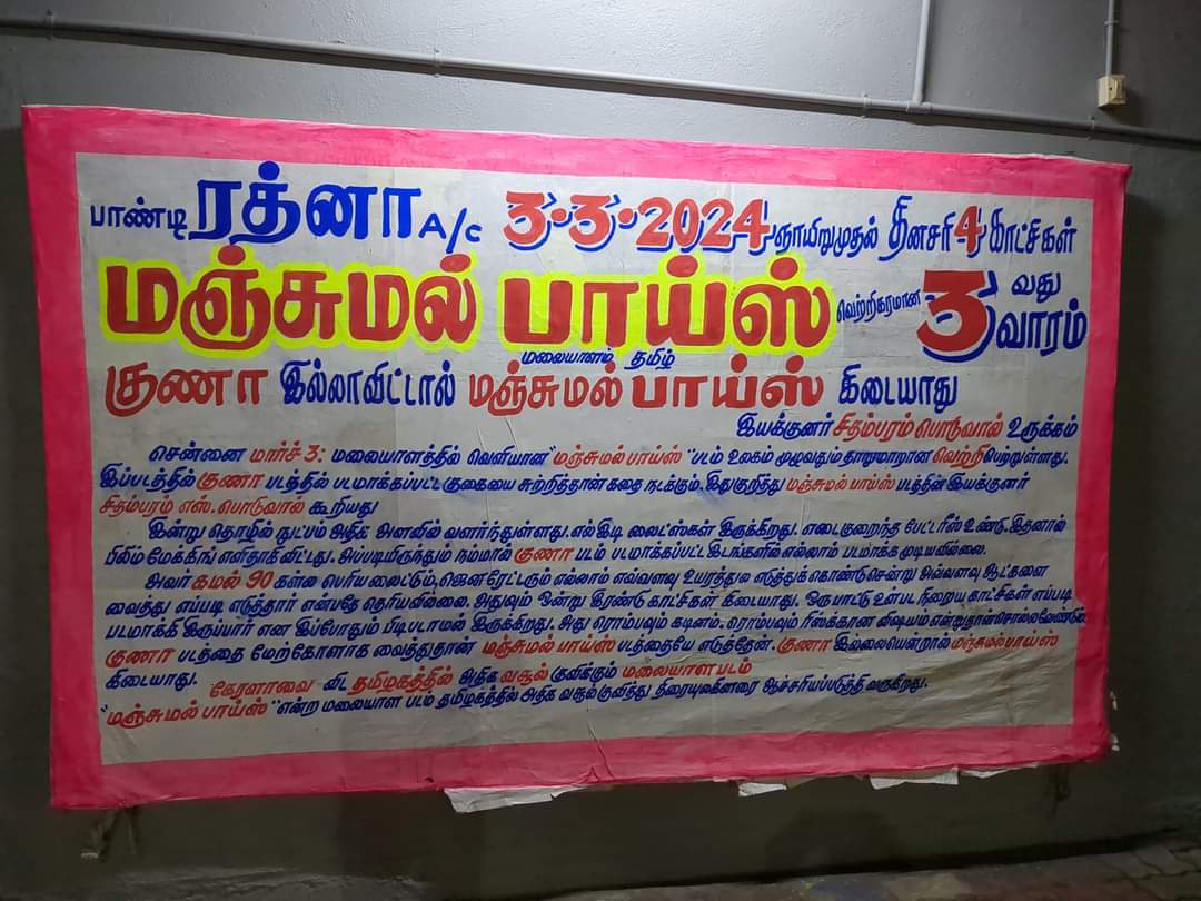പോണ്ടിച്ചേരി അണ്ണാശാലൈയിൽ, അണ്ണാദുരൈയുടെ പ്രതിമ സ്ഥാപിച്ച ജങ്ക്ഷനിൽ നിന്ന് അധിക ദൂരമില്ലാതെയാണ് രത്തിന എന്ന സിനിമാശാല ഉള്ളത്. ഇവിടെ മഞ്ഞുമ്മൽ ബോയ്സ് മൂന്നാം വാരം ആരംഭിക്കുന്ന അവസരത്തിലാണ്, ചുറ്റിയടിച്ച് ഞാനവിടെ എത്തിയത്. തിയേറ്റർ വളപ്പിനകത്തെ ചുമരിൽ മഞ്ഞുമ്മൽ ബോയ്സ് എന്തുകൊണ്ട് വിജയിച്ചു എന്നത് കൈ കൊണ്ട് മനോഹരമായെഴുതി പതിച്ചിരുന്നു. വടക്കേ കോയമ്പത്തൂരിലുള്ള സെൻട്രൽ & കനകധാര എന്ന ഇരട്ട സിനിമാശാലയിൽ ക്ലിഫ് ഹാംഗർ എന്ന ഹോളിവുഡ് ബ്ലോക്ക് ബസ്റ്റർ കാണാൻ പോയപ്പോൾ കണ്ട ചുമരെഴുത്താണ് എനിക്കോർമ്മ വന്നത്. ഉയരമുള്ള വലിയ ചുമരിൽ പെയിന്റ് ഉപയോഗിച്ച് ക്ലിഫ് ഹാംഗറിന്റെ തമിഴ് കഥാസാരം എഴുതിവെച്ചിട്ടുണ്ടായിരുന്നു. ഹോളിവുഡ് സിനിമകൾ തമിഴിൽ ഡബ്ബ് ചെയ്യാനക്കാലത്ത് തുടങ്ങിയിട്ടുണ്ടായിരുന്നില്ല. സിനിമകളോടും കാണികളോടും എല്ലാം തിയേറ്റർ നടത്തിപ്പുകാർക്കും മറ്റുമുള്ള കരുതൽ മനോഭാവമാണ് ഈ കയ്യെഴുത്തു വിവരണങ്ങളിൽ നിന്ന് എനിക്കനുഭവപ്പെട്ടത്.