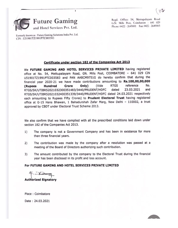 In an RTI reply to Shri. Sanjeev B. Ezhava, dated 22. 11.23, the SBI has provided details of electoral bonds for 6 years in just 6 days. Now why it requires months now ? (letter attached). It is surprising that a company ‘Future gaming’ has donated Rs. 100 crores to a trust named “Prudent Electoral Trust” a trust approved by CBDT under Electoral trust scheme 2013 (letter enclosed). Is this trust playing the role of a broker between political parties, Enforcement Directorate, CBI and companies which are doing illegal transactions.